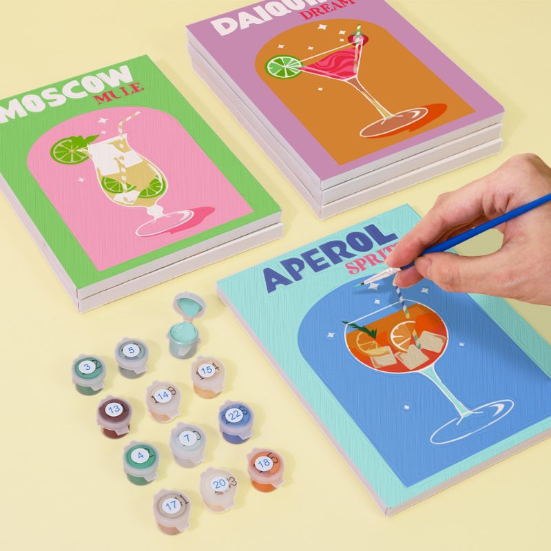 - 12 unieke mini schilderen op nummer ontwerpen met een cocktailthema