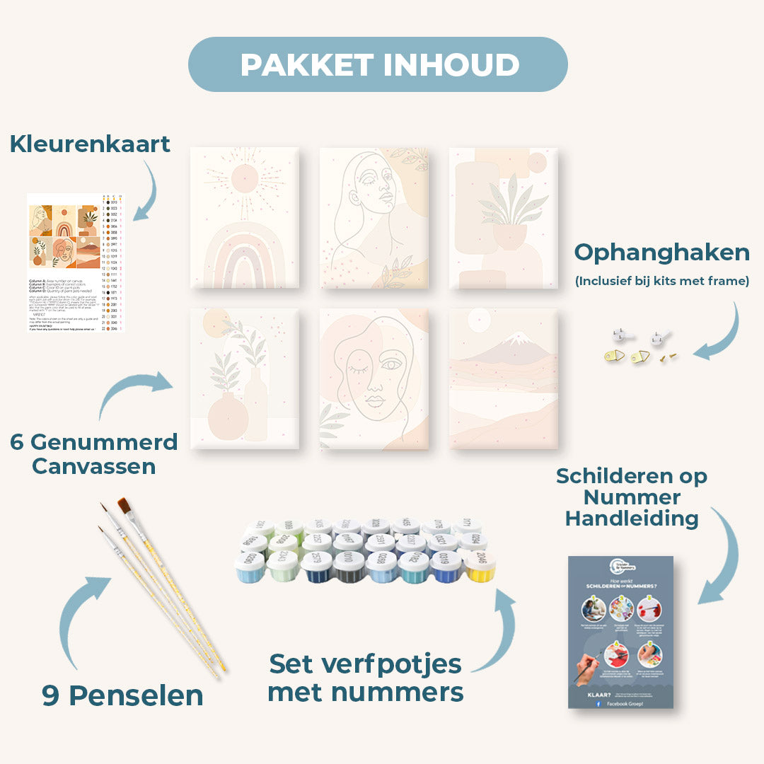 Deze Mini Paintings zijn geschikt voor alle niveaus, zodat iedereen het plezier van Schilderen op Nummer kan ervaren. Elke kit bevat meerdere kleine Canvasdoeken, Acrylverf en 9 kwasten.