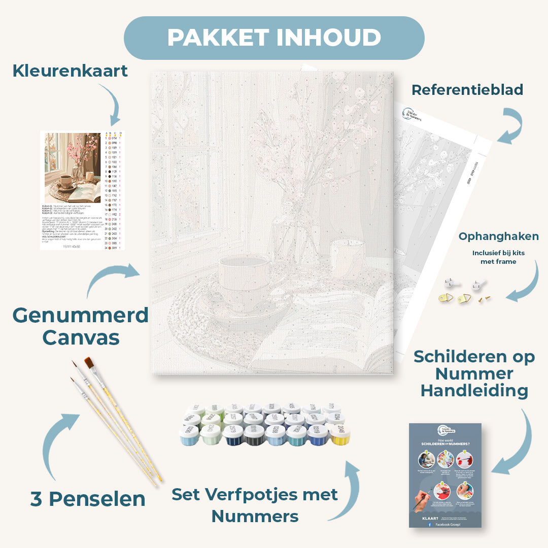 Ons Schilderen-op-Nummer pakket bevat alles wat je nodig hebt om direct aan de slag te gaan. Ontspan, geniet van het schilderproces en focus je volledig op je kunstwerk – wij zorgen voor de rest: