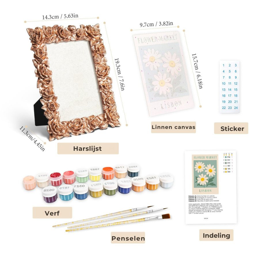 Dit compacte schilderproject is ideaal als decoratie of om cadeau te geven. Het wordt geleverd met een hoogwaardige resin fotolijst, zodat je de painting na afloop direct kunt neerzetten.