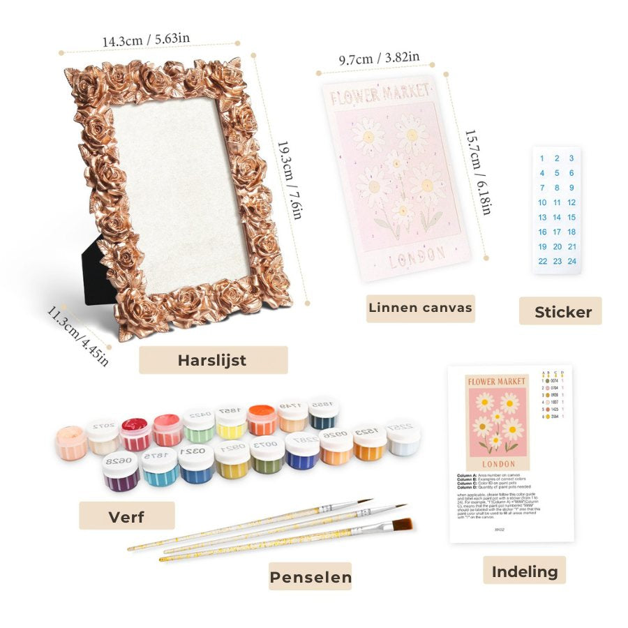 Dit compacte schilderproject is ideaal als decoratie of om cadeau te geven. Het wordt geleverd met een hoogwaardige resin fotolijst, zodat je de painting na afloop direct kunt neerzetten.