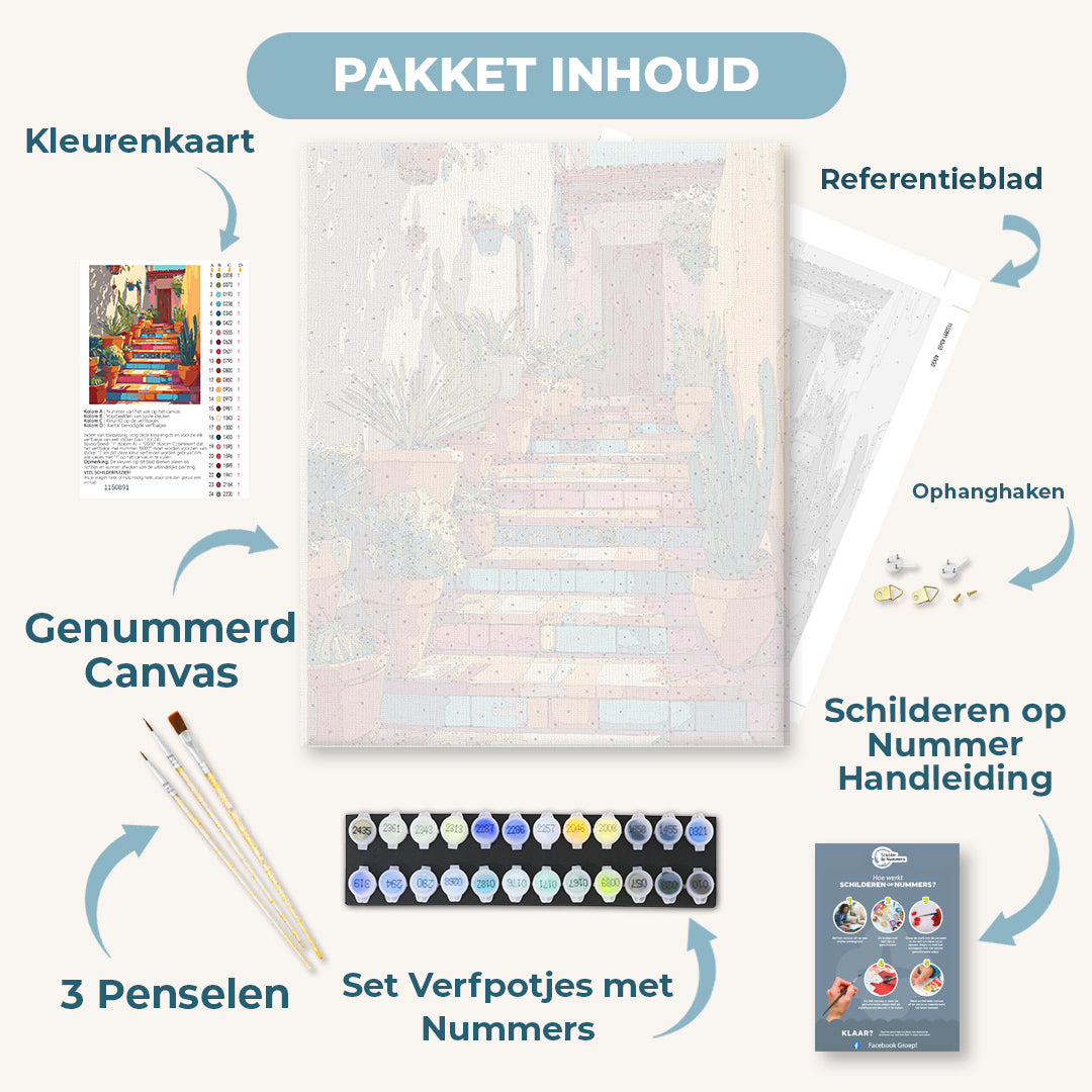 Ons Schilderen-op-Nummer pakket bevat alles wat je nodig hebt om direct aan de slag te gaan. Ontspan, geniet van het schilderproces en focus je volledig op je kunstwerk – wij zorgen voor de rest: