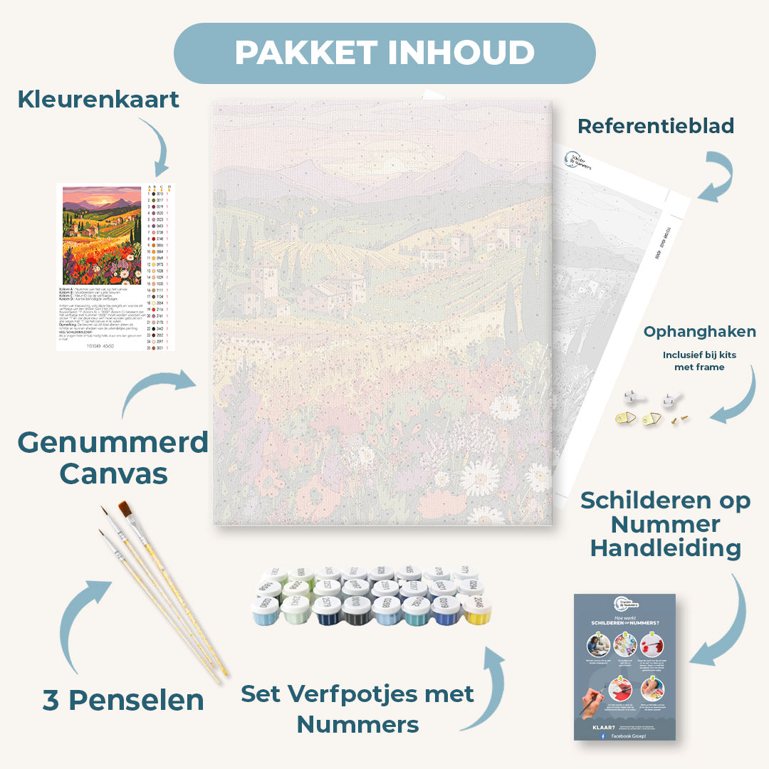 Ons Schilderen-op-Nummer pakket bevat alles wat je nodig hebt om direct aan de slag te gaan. Ontspan, geniet van het schilderproces en focus je volledig op je kunstwerk – wij zorgen voor de rest: